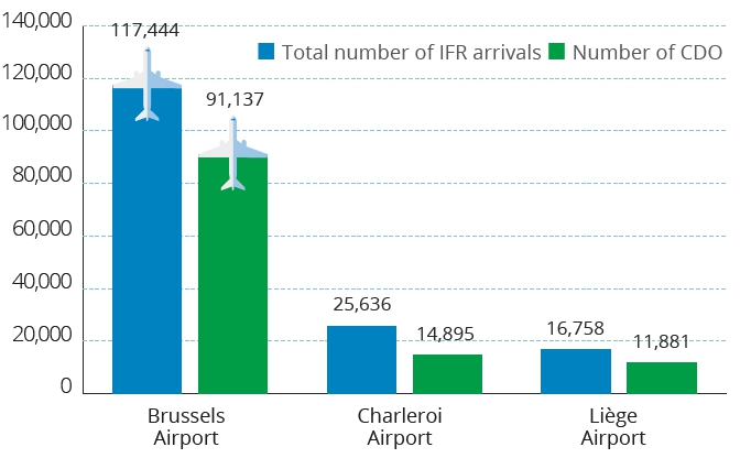 In 2017, over 73.2% of landings followed the green landing procedure at the airports of Brussels, Liège and Charleroi where it is applied.